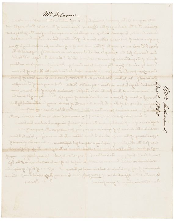 Docket upon the last blank reverse page is in the hand of the recipient and it reads: “Mr. Adams -” and “Mr. Adams Dec. 1830”. This remarkable political and historic content Letter is fully in the hand of Adams. It is absolutely the finest and most important Autograph Letter Signed by John Quincy Adams that we have ever enjoyed the privilege to offer.