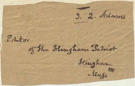 (1767-1848) Sixth President of the United States, Secretary of State under Monroe, principally formulated the Monroe Doctrine. An envelope panel addressed entirely in his hand and with franking signature at top right, sent to the Editor of the Hingham Patriot. Wrinkled, mounted, very good.
