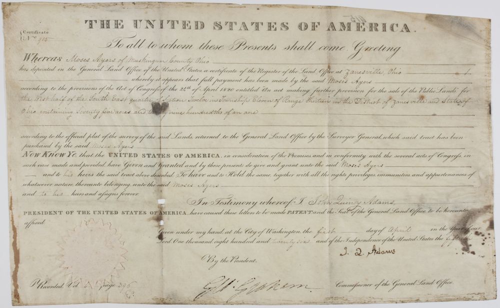 (1767 - 1848) Sixth President of the United States, Secretary of State under Monroe who principally formulated the Monroe Doctrine. Partly-printed D.S. as President, 1p. oblong folio on vellum, Washington, Apr. 1, 1826, a land certificate issued to Moses Ayers for a 75-acre tract near Zanesville, Ohio. With intact paper seal of the United States. Some losses at fold intersections, moderate cockling and toning, else very good overall.