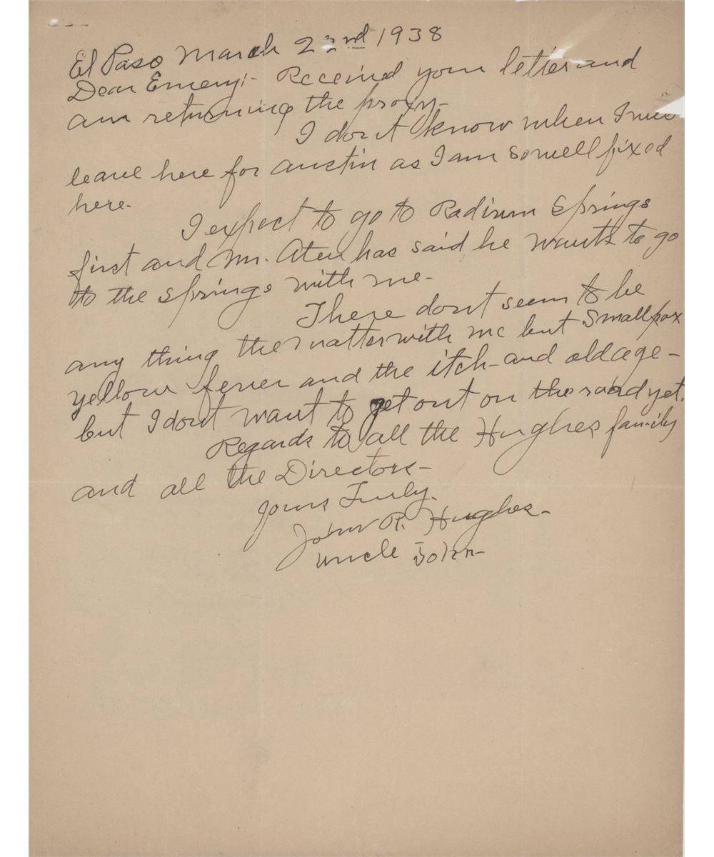 (1855 - 1947) Texas Ranger who captured Catarina Garza, who started the "Garza war", also captured Charles F. Dodge and many other most-wanted men. Particularly remembered for his excellent detective skills. Rare A.L.S. 1p. 4to., El Paso, Mar. 22, 1938, to his nephew, in part: "...I don't know when I will leave here for Austin...There don't seem to be anything that matter with me but small pox yellow fever and the itch - and old age - but I don't want to get out on the toad yet...". Two small holes at top affect a few letters of text, else very good.