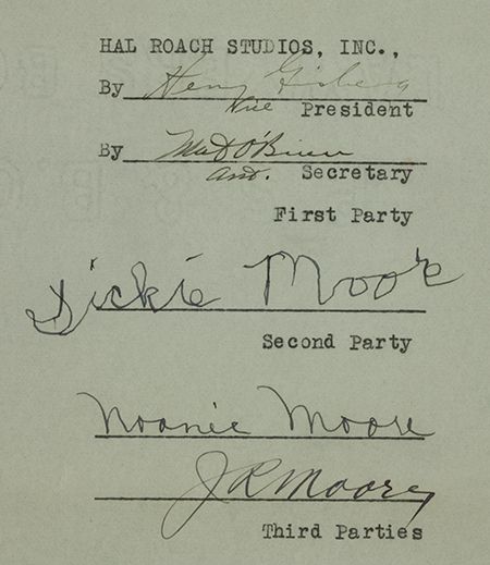 (b. 1925) American child actor who starred in numerous films such as Oliver Twist" (1933) as a regular on television. Typed D.S. 12pp. legal folio, [Los Angeles], Apr. 8, 1932, an employment contract between Moore and the Hal Roach Studios for appearing in "photoplays, radio broadcasts, and such stage performances...". These would turn out to be his role in Oliver Twist and in the Our Gang series for the 1932-33 season. Boldly signed by the 7-year-old star on final page, and countersigned by his parents. Along with a typed Supplemental Petition to the aforesaid contract by Hal Roach, not signed. Very good.