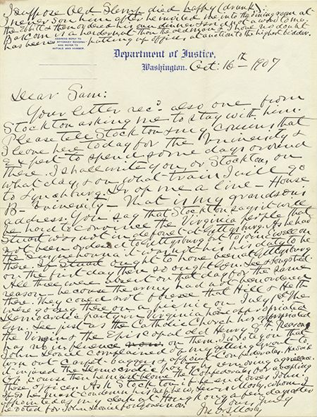 (1833 - 1916) Confederate officer, "The Grey Ghost" led his Partisan Rangers on numerous troublesome raids against Union forces and supply trains. Superb Gettysburg and political content A.L.S. on Dept. of Justice letterhead, 1p. 4to., Washington, Oct. 16, 1907 to "Sam" , likely Samuel F. Chapman, Mosby's "Fighting Parson" and a fellow ranger. In part: "...Please tell Stockton [Terry, ex-color bearer for Mosby's Rangers] and my cousins that I leave here today for the University [of Virginia]...Stockton says it will be hard to convince the Virginia people that [cavalry General J. E. B.] Stuart was not in default at Gettysburg. As he had not been ordered to Gettysburg, but to join Ewell on the Susquehanna, it was not his duty to be there. If Stuart ought to have been at Gettysburg on the first day then so ought General Lee and Longstreet. All three were absent on that day for the same reason - because the army had not been ordered there. They could not foresee that [Gen. Ambrose P.] Hill and [Gen. Henry] Heth were going there on a picnic on July 1. The Democratic Party in Virginia has appropriated General Lee just as the Catholic Church has appropriated the Virgin and the Episcopal old Henry VIII. Reason has no influence on them. I wrote you that John Daniel [a Mosby Ranger] complained of my getting Grant to turn out carpetbaggers and appoint Confederates. He said it injured the Democratic Party by rendering a grievance. Of course then he must blame the Confederates for accepting these offices. Ask Stockton if he endorses John. If so, he must condemn his nephew Lewis Mosby...". In a postscript he adds: "...I suppose old [Campbell] Slemp [Colonel of the 64th Virginia Infy.] died happy (drunk)...Bascom is a hardened nutand I have no doubt has been putting up office at auction to the highest bidder...". Fine condition. A remarkable letter! "Jeb" Stuart has long been (wrongfully) partially blamed for the Confederate loss at Gettysburg. Lee has anticipated his arrival there prior to the first day of battle, July 1, but he did not arrive until late on July 2, after plans for "Pickett's Charge" had already been made. In actuality, Stuart had followed two conflicting orders from Lee to harass Hooker's army from behind, while destroying canal locks and communications. And Mosby's involvement? His Partisan Rangers were directly under Stuart's command, and it was Mosby who was Stuart's advisor as to which routes should be used for his incursion into Maryland, so of course it benefitted Mosby to protect himself historically...and politically. After the war, Mosby befriended Grant , became a Republican, and paid a heavy price for going against the political tide in Virginia: he received death threats, his boyhood home was burned down, and at least one attempt was made to assassinate him. Said Mosby: "There was more vindictiveness shown to me by the Virginia people for my voting for Grant than the North showed to me for fighting four years against him."