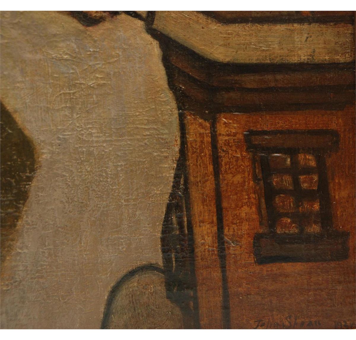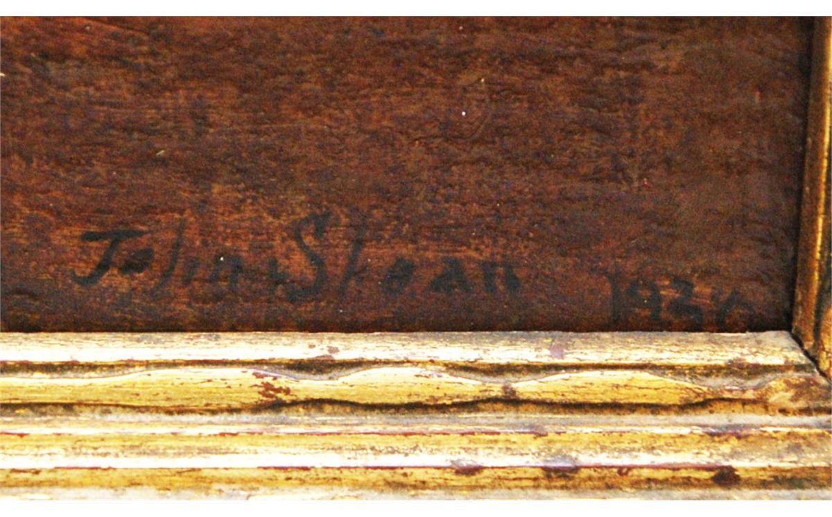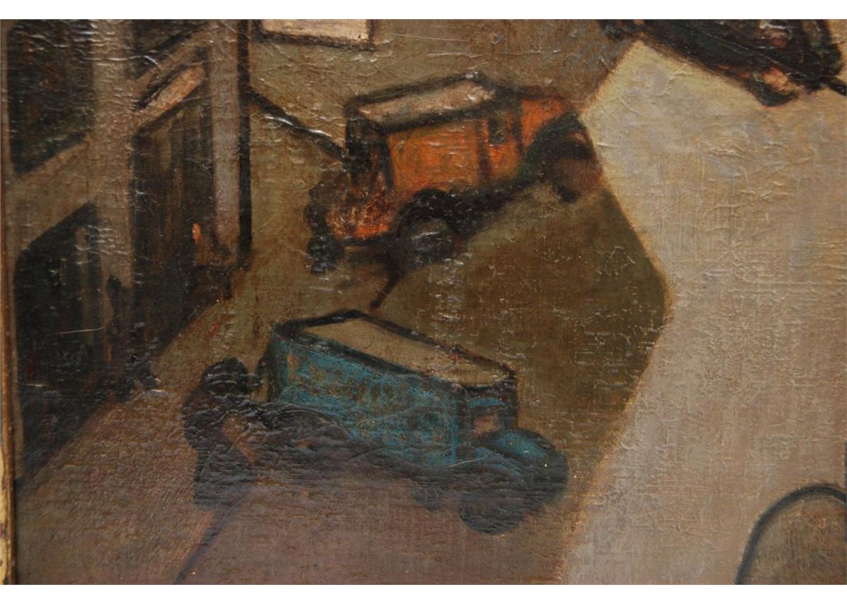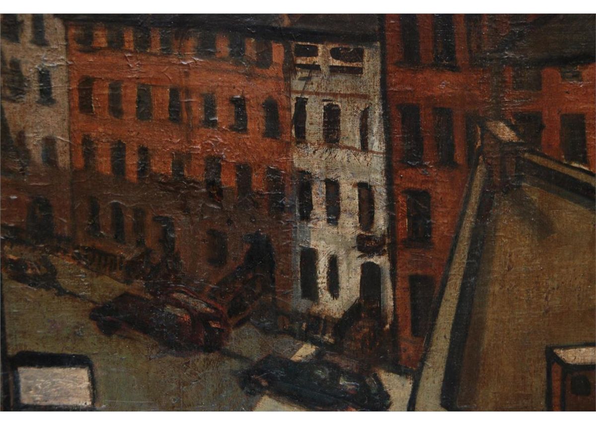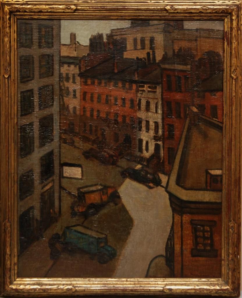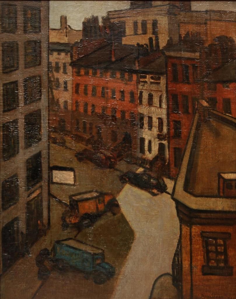 John Sloan (AMERICAN, 1871-1951) oil painting on board depicting a street scene with cars and buildings. Signed to lower right and dated 1930. Mounted in gilded frame. Measures 25" height x 20" width + 1 3/4" frame (63.5cm x 50.8cm + 4.4cm). Provenance: Property of a Royal Palm Beach gentleman.