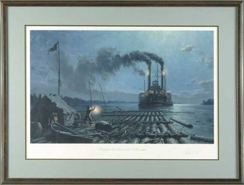 JOHN STOBART (American, 1929-) “MOONLIGHT ENCOUNTER ON THE MISSISSIPPI”. Signed limited edition print numbered 457/750. Print shows a man with lantern on log raft looking up river to an oncoming large paddlewheel. Nicely housed in a decorated wood frame with double matte. SIGHT SIZE: 22-1/2” x 32”. CONDITION: Very good. 9-26736