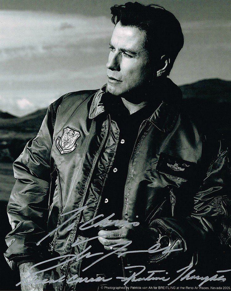 JOHN TRAVOLTA: Photographed at the Reno air races in Nevada in 2005, and inscribed by John Travolta in silver pen. 10x8 inches.