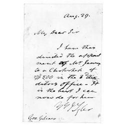 <b>179. JOHN TYLER </b>(1790 - 1862) Tenth President of the United States following the death of Harrison, annexed Texas, and remained loyal to Virginia following its secession. A.L.S. as President, 1p. 8vo., [n.p.], Aug. 29, [1841] to Governor [Thomas Walker] Gilmer regarding the appointment of Mr. Janney. In part: "<i>...I have...directed the appointment of Mr. Janney to a Clerkship of $800 in the 3d Auditor's Office. It is the best I can do for him...</i>". Gilmer, of the Whig party, was the Governor of Virginia from 1840 to 1841. Light to moderate soiling, otherwise very good.<b> $600-800</b>
