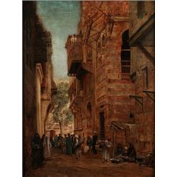 JOHN VARLEY jnr. England, active 1870-1899 The school of Sheik EL Roulam in the Hassaneyn quarter, Cairo Signed and dated John Varley 82. On the reverse inscription: School of Sheik el Roulam in the Hassaneyn quarter/Cairo - painted on the spot in 1882/John Varley. Oil on canvas, 61 x 46 cm.