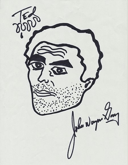 (1942 - 1994) Notorious mass murderer of over thirty young men whom he buried beneath his home, executed after many appeals and postponements. Original drawing of fellow serial killer "Ted [Bundy]" executed in black marker on a quarto sheet, signed in full at lower right. Fine.