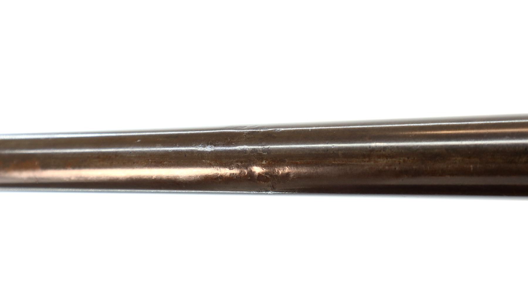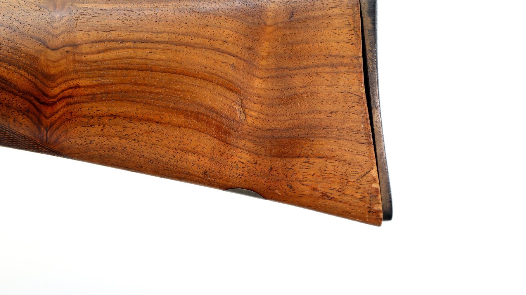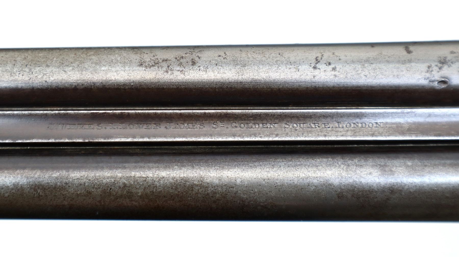 Main Description: Brass bead, round Nitro proof barrels with smooth rib marked J. Wilkes 1 Lower James St, Golden Square London that chime and are slightly loose on face. Nicely engraved receiver and trigger guard, automatic safety, extractor, double triggers. Two piece wood stocks, checkered forearm with engraved latch, straight grip, chipped cracked and broken, repaired with wood and wrapped with black tape. Checkered black polymer Remington butt plate which does not fit well, 14" LOP, vanity plate.