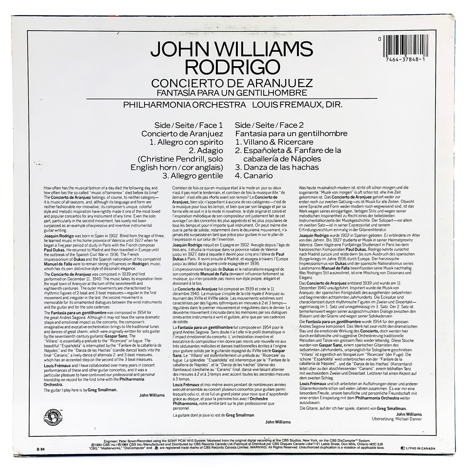 #9541 - VINYL LP RECORD ALBUM. CLASSICAL. JOHN WILLIAMS - RODRIGO CONCIERTO DE ARANJUEZ - FANTASIA PARA UN GENTILHOMBRE - PHILHARMONIA ORCHESTRA. CBS MASTERWORKS RECORDS IM 37848. RECORD ALBUM FROM PRIVATE COLLECTION OF CLASSICAL/OPERA RECORDS.