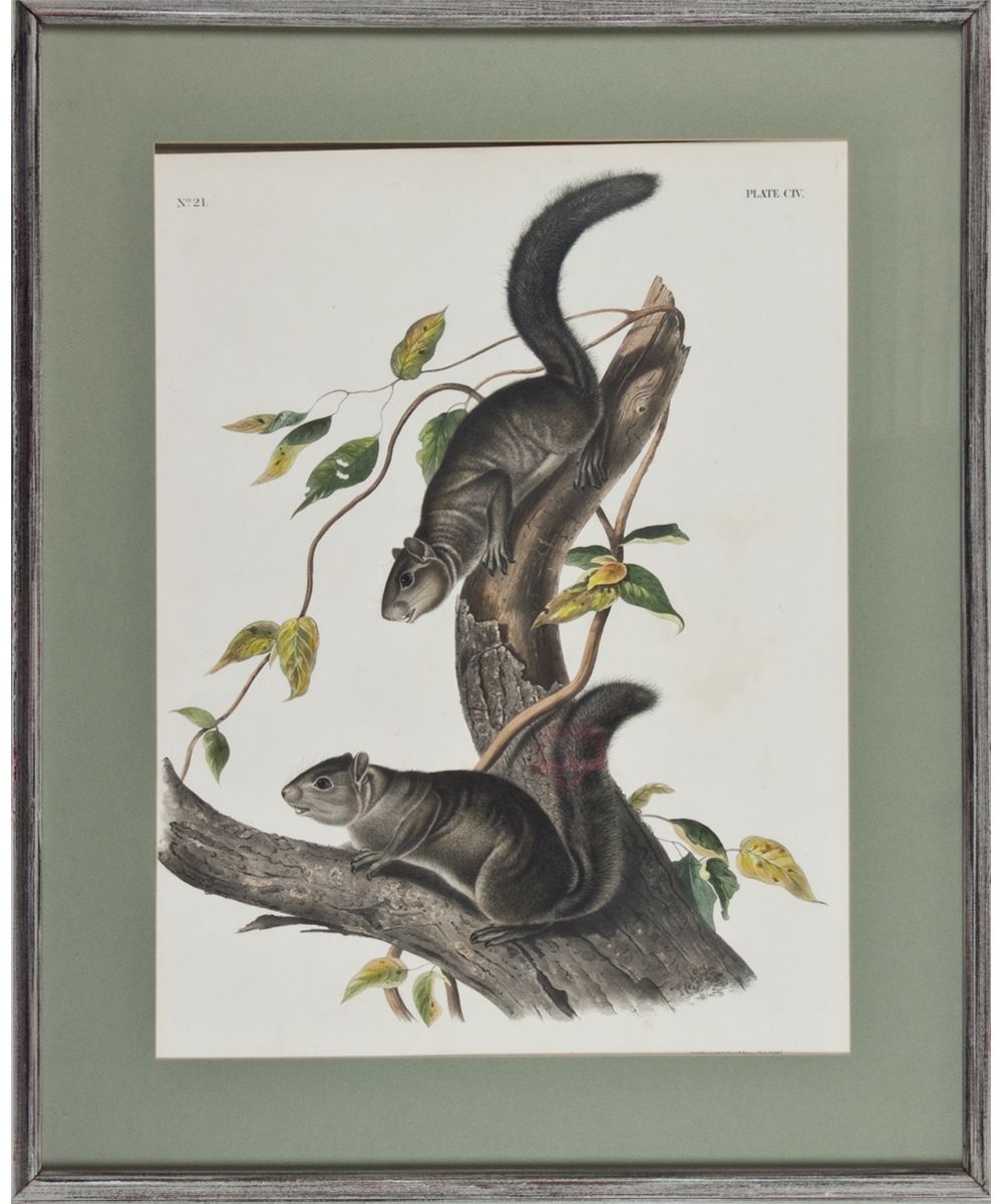 (1812 - 1862) Imperial lithograph, 24 1/2" x 18" (sight) Collies Squirrel, plate CIV, from The Viviparous Quadrupeds of North America, lithograph printed in colors and heightened with touches of gum Arabic, by J.T. Bowen, Philadelphia, 1847. Matted and framed. Light toning toward right center, else fine condition. Not examined out of frame, however the piece appears to have slipped from one of the hinges.