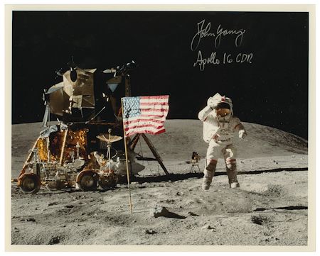 (b. 1930) American astronaut who walked on the moon three times in the Apollo 16 mission; also the first man to fly into space six times. Fine S.P. 10" x 8" color, a great shot of Young walking on the moon next to the L.E.M., boldly signed in silver ink: "John Young Apollo 16 CDR". Fine condition.