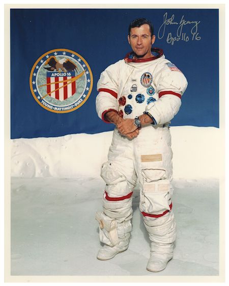 (b. 1930) American astronaut who walked on the moon three times in the Apollo 16 mission; also the first man to fly into space six times. S.P. 8" x 10" color, shows Young in suit in a full length pose, with Apollo 16 seal at left. Boldly signed in silver marker: "John Young Apollo 16". Fine condition.