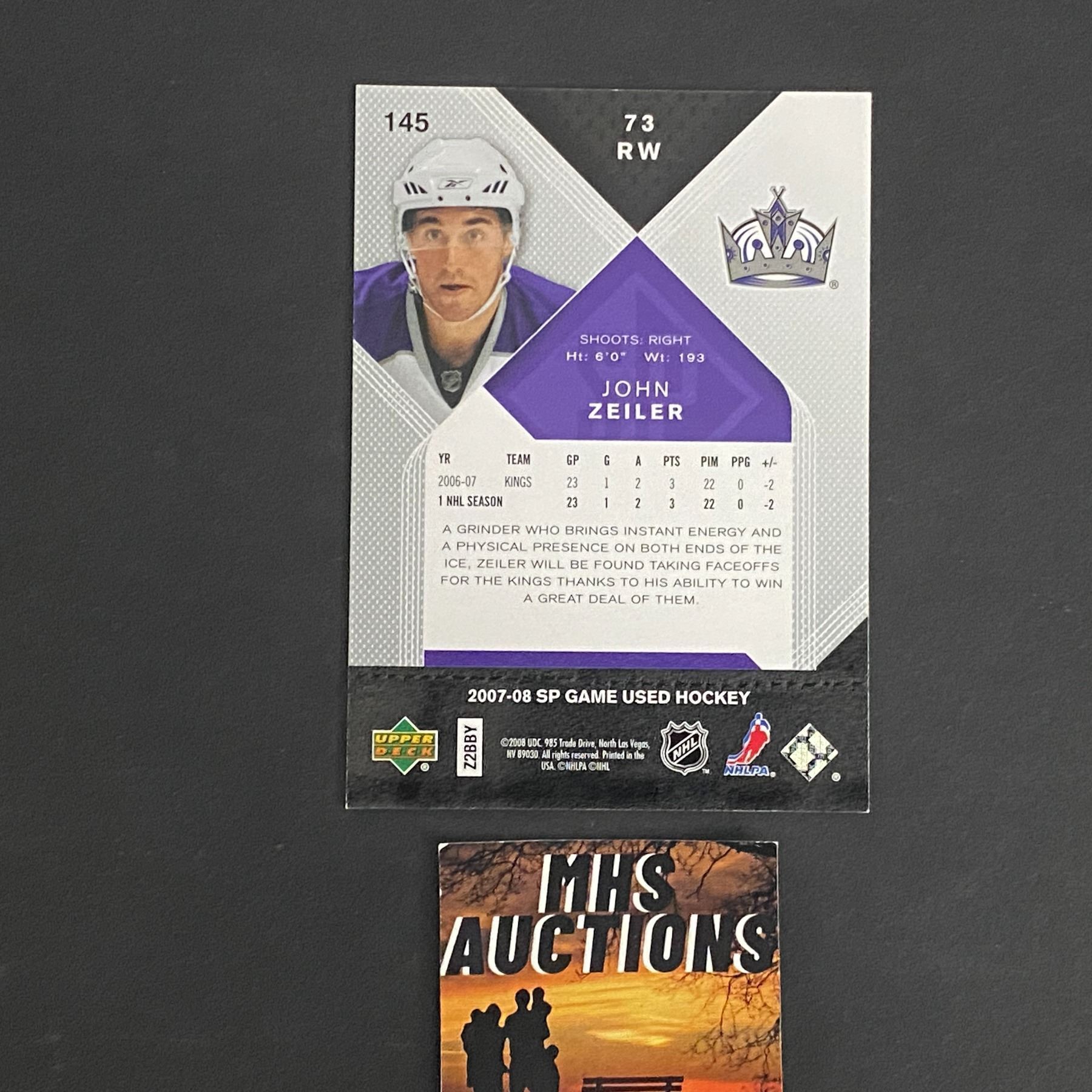 JOHN ZEILER 2007-08 SP GAME USED ROOKIE HOCKEY CARD