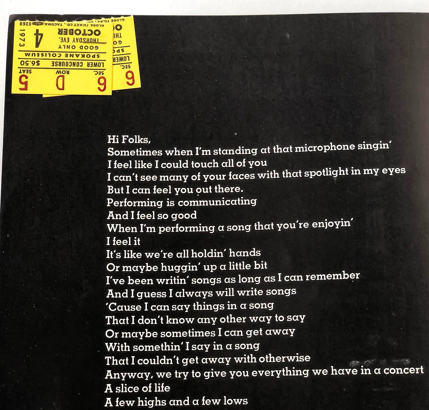 #8217 - CONCERT BOOKLET & TICKET STUBS, SPOKANE COLISEUM, SPOKANE WA., 1973***ITEM(S) LOCATED IN LETHBRIDGE ALBERTA. ALL ITEMS IN THIS AUCTION QUALIFY FOR OUR FREE TRANSPORT TO EDMONTON SERVICE. WORLDWIDE SHIPPING AVAILABLE