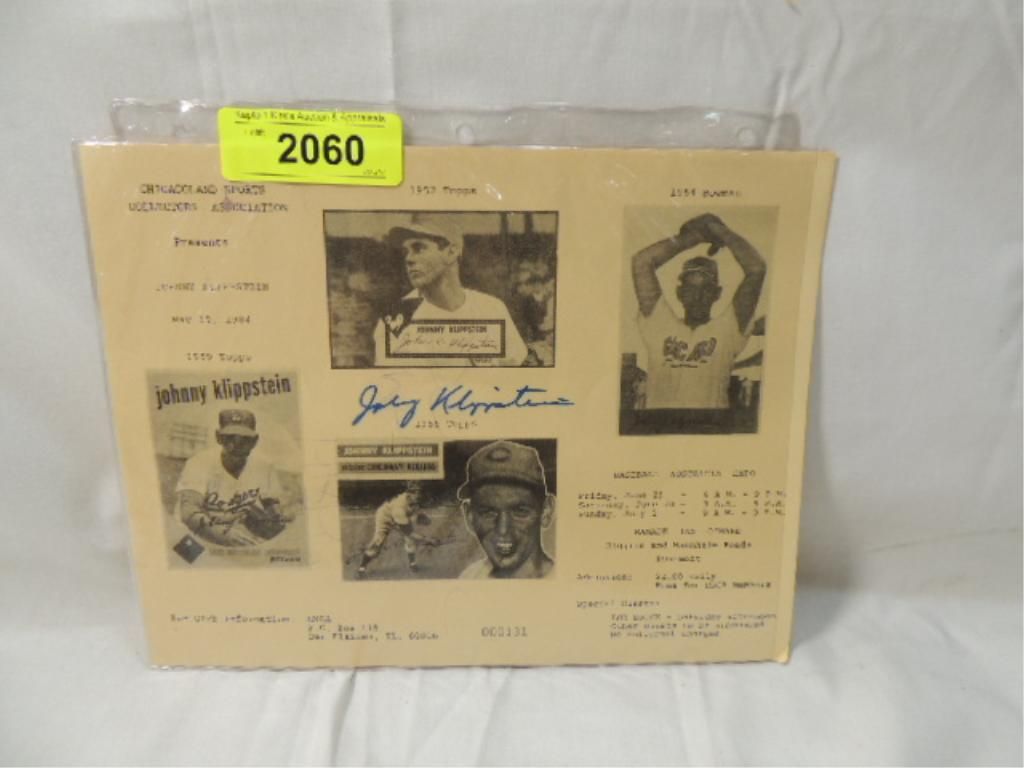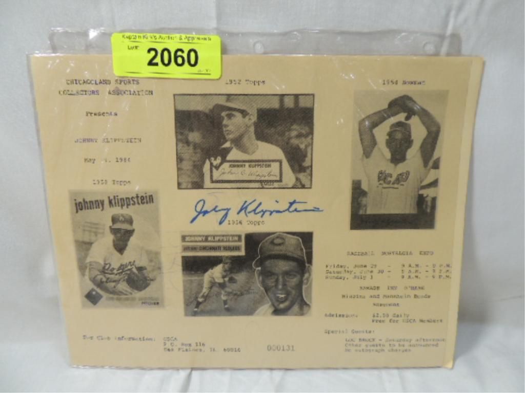 CHICAGOLAND SPORTS COLLECTORS ASSOCIATION FLYER AUTOGRAPHED JOHNNY KLIPPSTEIN. AS SHOWN. SEE PHOTO FOR MORE DETAILS. PLEASE BE ADVISED, AND INFORMED REGARDING SIGNATURES OR AUTOGRAPHS THAT WE SELL AT AUCTION: WE ARE NOT AUTHENTICATORS, AND WE DO NOT AUTHENTICATE, OR VALIDATE ANY AUTOGRAPHS OR SIGNATURES THAT WE OFFER AT AUCTION. SOME AUTOGRAPHS OR SIGNATURES MAY COME WITH AN AUTHENTICATION FROM ANY ONE OF LITERALLY HUNDREDS OF AUTHENTICATORS ACROSS THE COUNTRY, AND AROUND THE WORLD. WE DO NOT ENDORSE ANY AUTHENTICATOR, NOR DO WE GUARANTEE THAT ANY AUTOGRAPH OR SIGNATURE IS AUTHENTIC, OR THAT IT WILL PASS AUTHENTICATION BY ANY AUTHENTICATOR. ALL AUTOGRAPHS OR SIGNATURES ARE SOLD