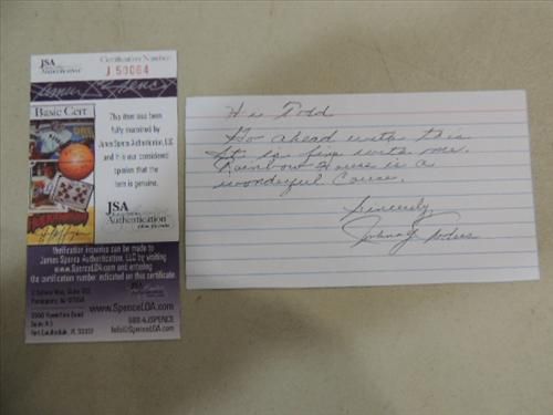 JOHNNY PODRES SIGNATURE AUTOGRAPH ON CARD COA. INCLUDES COA FROM JSA #J50064. AS SHOWN. VIEW PICTURE FOR DETAIL. PLEASE BE ADVISED, AND INFORMED REGARDING SIGNATURES OR AUTOGRAPHS THAT WE SELL AT AUCTION: WE ARE NOT AUTHENTICATORS, AND WE DO NOT AUTHENTICATE, OR VALIDATE ANY AUTOGRAPHS OR SIGNATURES THAT WE OFFER AT AUCTION. SOME AUTOGRAPHS OR SIGNATURES MAY COME WITH AN AUTHENTICATION FROM ANY ONE OF LITERALLY HUNDREDS OF AUTHENTICATORS ACROSS THE COUNTRY, AND AROUND THE WORLD. WE DO NOT ENDORSE ANY AUTHENTICATOR, NOR DO WE GUARANTEE THAT ANY AUTOGRAPH OR SIGNATURE IS AUTHENTIC, OR THAT IT WILL PASS AUTHENTICATION BY ANY AUTHENTICATOR. ALL AUTOGRAPHS OR SIGNATURES ARE SOLD