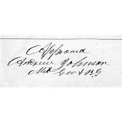 (1808 - 1875) Seventeenth President of the United States who came to office following the death of Abraham Lincoln. A squabble with Stanton along with his Reconstruction policies led to an impeachment by Congress. Very rare war-date partly-printed D.S. "Andrew Johnson" as military governor of Tennessee and brigadier general, 1p. folio, Nashville, [circa 1864], concerning the loss of "...One wall tent…Five Burnside tents…twenty two Shibley tents and poles…", in the charge of Captain Francis Ryan at Nashville on the N. & N. W. R. R. Very good.