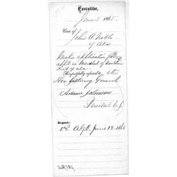 (1808 - 1875)  Seventeenth President of the United States following the death of Abraham Lincoln, his Reconstruction policies led to his impeachment by Congress. Partly-printed D.S. as President, 1p. 12mo., Washington, June 5, 1865, a signed endorsement on an Executive envelope, forwarding to the Attorney General the application of John Noble for his appointment as Marshal of the Northern District of Alabama. Minor staining, not affecting bold, clear signature, very good.