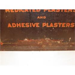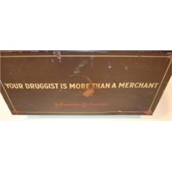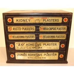 JOHNSON & JOHNSON TIN DRUGGIST CASE. 5 drawers for various plasters. Marked "Johnson & Johnson-Medicated Plasters and Adhesive Plasters" on front. Severe rusting to bottom of base. 12.75" H, 15" W, 8.5" D
