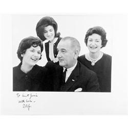 (1908 - 1973) Thirty-sixth President of the United States and creator of the "Great Society" social welfare programs. America's growing involvement in Vietnam led to his declining a renomination as president. Fine I.S.P. 14" x 12" b/w, a neat casual shot showing the Johnson family in head and shoulders. Inscribed on the mount beneath the image: "To Aunt Jessie with love L.B.J.". Slight soiling to edges, otherwise very good.