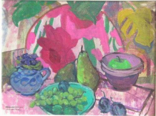 JOHNSTON, Francis Anne, R.C.A., 1910-1987. "Still Life with Fruit". Huile sur panneau, signée. Signée et titrée verso. Oil on board, signed. Signed and titled verso. 12" x 16" - 30.5cm x 40.6cm.
