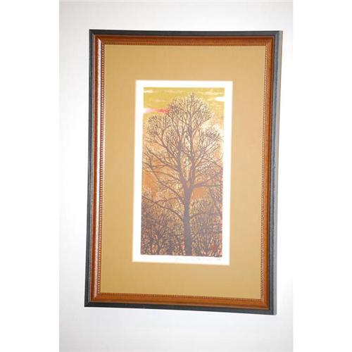 JOICHI HOSHI JAPANESE WOODBLOCK ENGRAVING - JOICHI<BR>HOSHI COLORED WOODBLOCK ENGRAVING OF BARE TREES-TITLED<BR>"EVENING", SIGNED & DATED 1974 ON LOWER RIGHT, MATTED<BR>& FRAMED W/ BIO ON BACK (10 1/2" X 5 3/4") - GOOD<BR>CONDITION