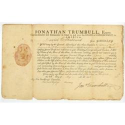 JONATHAN TRUMBULL: (1737 - 1778) Member of the Continental Congress and Commissary-General of the Continental Army from 1775 - 1777. Son of Connecticut governor Jonathan Trumbull. Partly-printed D.S. 1p. small oblong folio, Hartford, May 28, 1804, a military commission appointing David C. Hubbard as a Captain in the Connecticut militia. Light chipping to margins and very light foxing, otherwise very good. $150-200