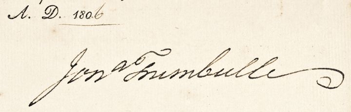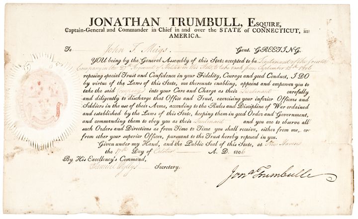October 17, 1806-Dated, Partly-printed Document Signed, "Jona Trumbull" as Governor of Connecticut, on fairly clean laid period paper, at New Haven, measuring 7.75" x 12.75", Very Fine. In this Military Commission, Governor Trumbull is Appointing John T. Meigs, "Lieutenant of the fourth Company in the 27th Regiment of Militia in this State..." and is Countersigned by Samuel Wyllys, as Secretary. Samuel Wyllys served as Secretary of the State of Connecticut from 1796 until his death in 1810. Boldly printed in deep black, there is some scattered light tone mostly at the outer edges and a couple of trivial pinholes at the folds. The large, beautiful embossed, 2.75” x 3.5” paper and red wax Connecticut State Seal is fully intact. Trumbull's huge 4.5" long signature is boldly signed at the lower right.