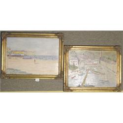 JORDAN (European, 20th century), pair of oils on canvas, "Boats on a European Village Canal", 1926; 16 inches by 20 inches, and "Am Lido", 1925; 14 inches by 19-1/2 inches, both signed and dated lower right