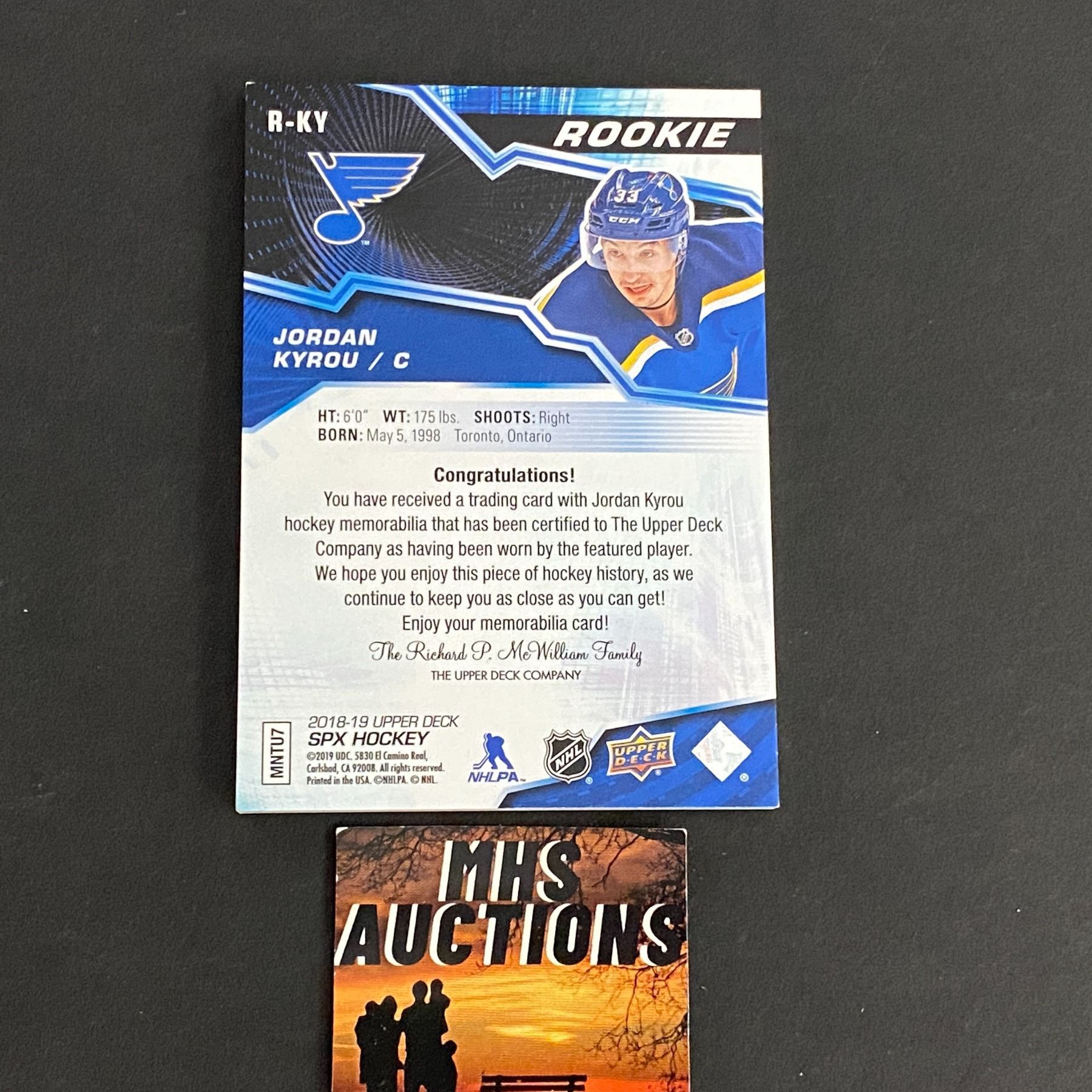 JORDAN KYROU 2018-19 SPX JERSEY HOCKEY CARD