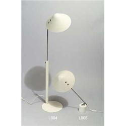 Aluminium, weiß lackiert. Zylindrischer Sockel, schräg verlaufender drehbarer Metallschaft, kegelförmiger Reflektor. Sockel und Schirm weiß lackiert. Elektrifiziert. Um 1970
