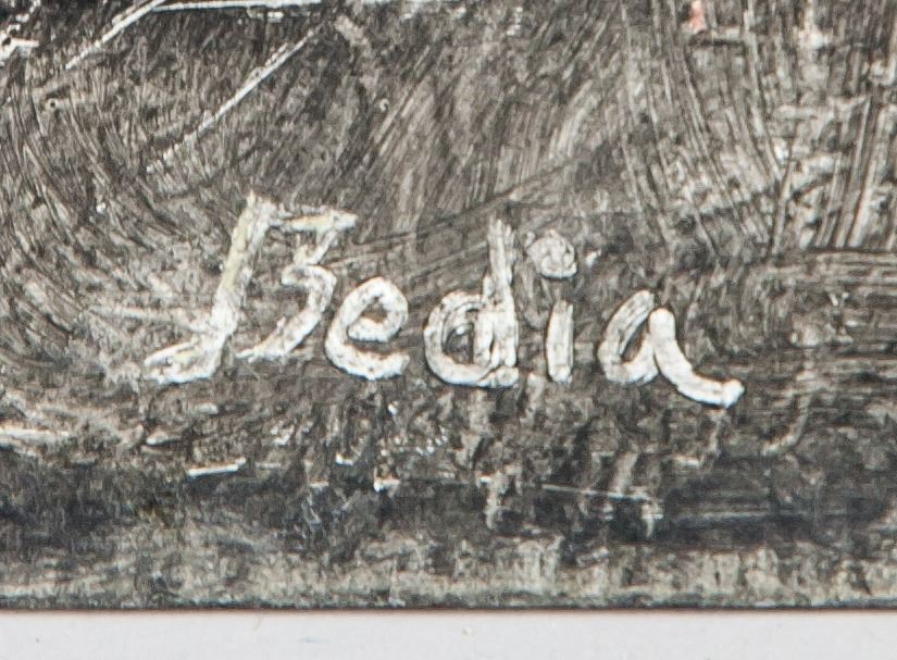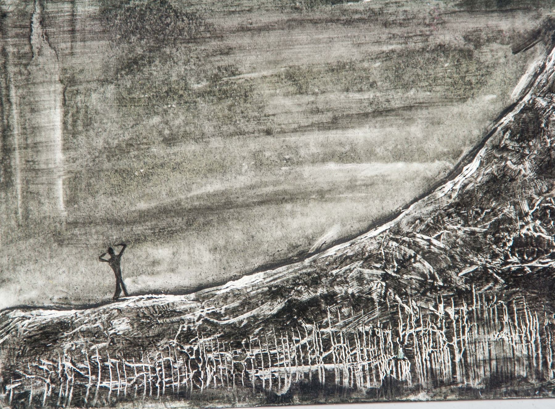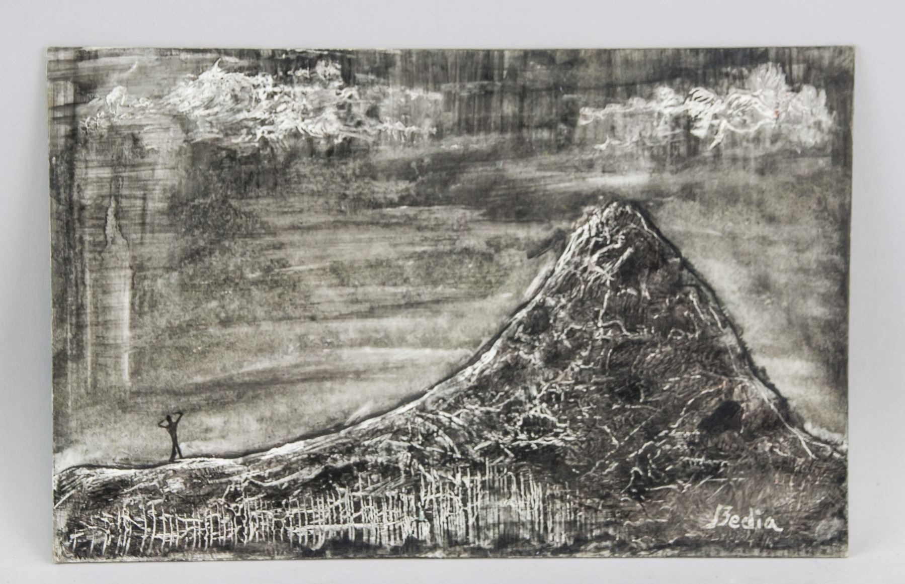 Printmaking on paper, featuring mountain landscape scene. Signed and attr. Jose Bedia Valdes (Cuban, b.1959). Signature on lower right corner. 6.5 x 10.2 in. (16.5 x 26 cm). Jose Bedia is a contemporary Cuban painter known for his Neo-Primitivistic figurative style. Bedia’s large-scale paintings are inspired by his Santería faith, an amalgamation of Yoruba, indigenous, and Christian beliefs, with his works frequently depicting mythical elements, altars, and other sacramental imagery, often serving as a pointed critique of colonialism. PROVENANCE: Private Collection (South America)