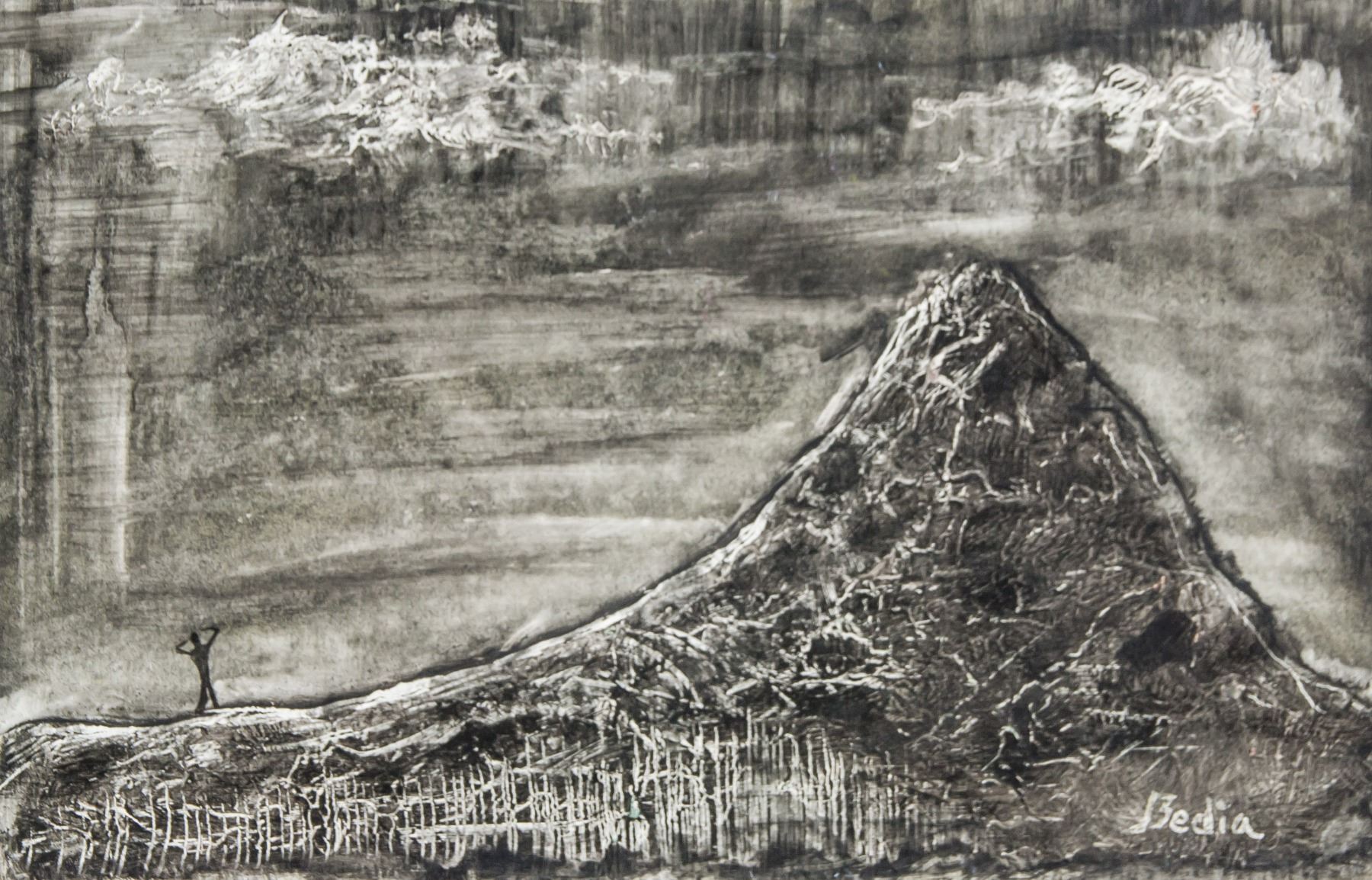 Printmaking on paper, featuring mountain landscape scene. Signed and attr. Jose Bedia Valdes (Cuban, b.1959). Signature on lower right corner. 6.5 x 10.2 in. (16.5 x 26 cm). Jose Bedia is a contemporary Cuban painter known for his Neo-Primitivistic figurative style. Bedia’s large-scale paintings are inspired by his Santería faith, an amalgamation of Yoruba, indigenous, and Christian beliefs, with his works frequently depicting mythical elements, altars, and other sacramental imagery, often serving as a pointed critique of colonialism. PROVENANCE: Private Collection (South America)