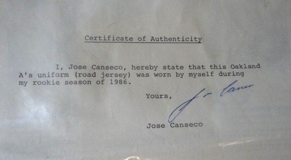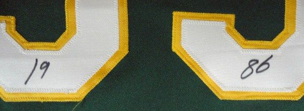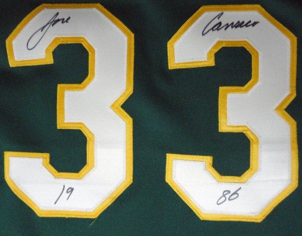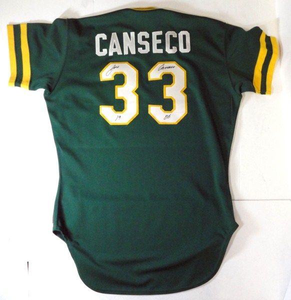 OAKLAND A's JOSE CANSECO AUTOGRAPHED ROOKIE JERSEY #33 AND DATED 1986 WITH CERT SIGNED BY JOSE CANSECO