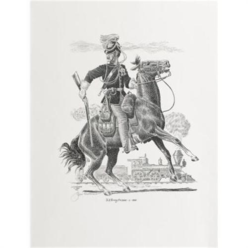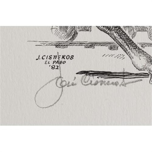 <B>JOSE CISNEROS (b. 1910)</B></I><BR>Untitled Portfolio with Three Prints by Jose Cisneros<BR>Etching on paper<BR>20 x 15 inches (50.8 x 38.1 cm)<BR>Signed lower left<BR><BR> Three signed prints from the portfolio titled: <I>Five Drawings by Jose Cisneros -- A Tribute to the Southwestern Horse Soldier.</B></I> Includes Spanish Conquistador, U. S. Army Corporal, and U. S. Army Private.<B>Condition Report:</B> Very minor stain on two prints. Unframed.<BR><BR><b>Shipping:</b> Requires 3rd Party Shipping (<a target="_blank" href="http://www.heritageauctions.com/common/shipping.php">view shipping information</a>)
