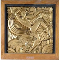 Lot # 1297 JOSE PICO MITJANS (1904-1991) JOSEPHINE BAKER. Gilt plaster relief tile with the classic art deco image of a nude Josephine Baker in dancing pose. Half circles, squares and rays in graduating form complete the image. This is a small version of the front façade of the Folies Bergere in Paris, France. This tile possibly could be from one of the inner halls. A classic art deco image worthy of any advanced collection. Housed in a stepped walnut frame. TILE SIZE: 19-1/2” x 19”. CONDITION: Very good. 9-98454 (4,500-6,500)