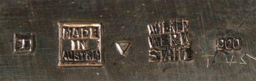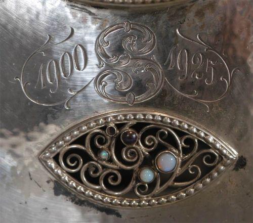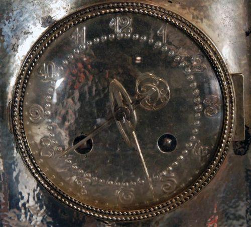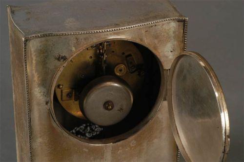 JOSEF HOFFMANN SILVER MANTLE CLOCK, for The Wiener Werkstatte, 7" high, set with opals, the bottom with touch marks for Hoffmann and The Wiener Werkstatte, engraved "1900-1925", condition: excellent and complete, silver with some tarnish, PACKING AND SHIP