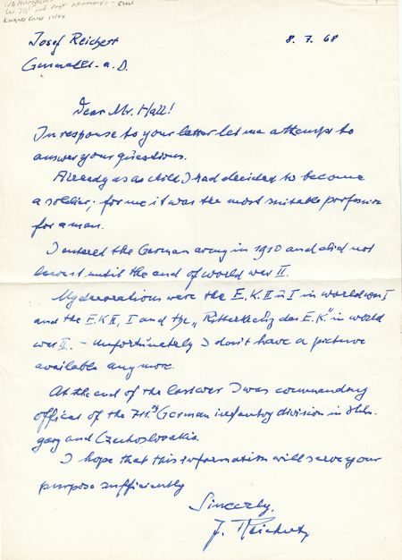 (1891 - 1970) Generalleutnant in the Wehrmacht , a recipient of the Knight's Cross. Good content A.L.S. 1p. large 4to., [n.p.], July 8, 1968, in english. In part: "...as a child I had decided to become a soldier; for me it was the most suitable profession for a man. I entered the German army in 1910 and did not leave it until the end of World War II...At the end of the last war I was commanding officer of the 711th German infantry division in Hungary and Czechoslovakia..." Reichert also mentions his being awarded his Knights Cross. Fine.
