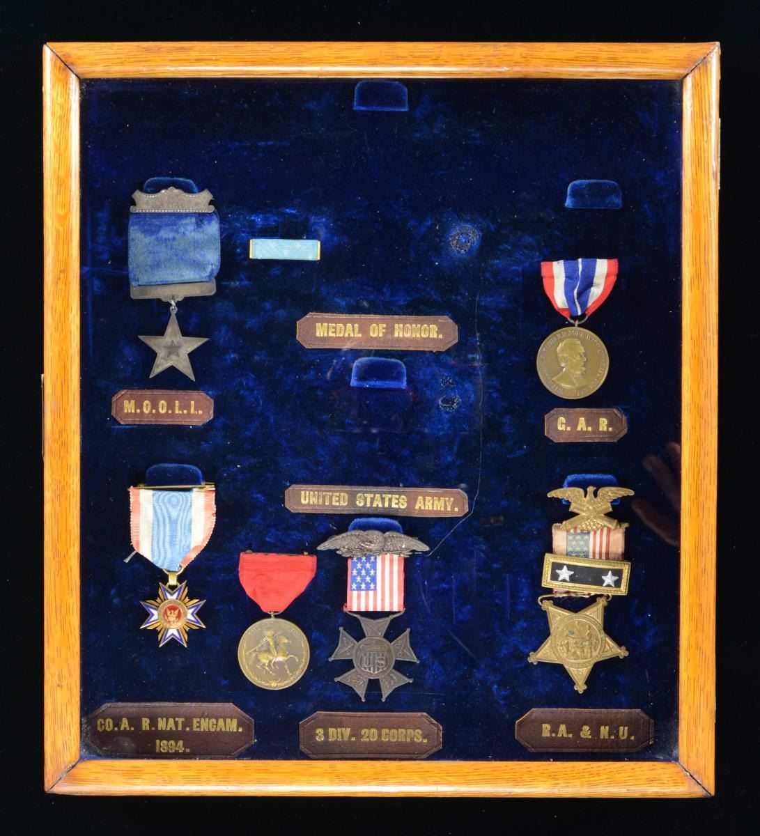 The frame of medals with missing with 2 empty spaces where Medals of Honor originally sat. The MOHs were previously donated to a national museum. Remaining medals include 33rd Massachusetts badge, GAR commander's badge (Major General), Civil War campaign medal # 127 & Indian War campaign medal # 232, and MOLLUS membership medal. Joseph was bit of an artist (as were his children) and made a 3 1/2 inch clay sculpture of the face of Abraham Lincoln and signed it with his initials. There is a black silk morning ribbon silk embroidered "President Lincoln" which is broken but still presents nicely. Bullseye Canteen with pewter spout probably used in Atlanta campaign, with remnants of gold paint and frayed red, white, and blue ribbon. Allen & Wheelock, 32 rimfire, pocket revolver, S# 517, 3" barrel, 1875 patented pocket case (holster), 3.5x2.5" wood block copper printing plate of Sladen as GAR post commander, GAR belt, box for his Civil War campaign ribbon bars. (02-17895-8, 01-23773/JS). $2,000-4,000.