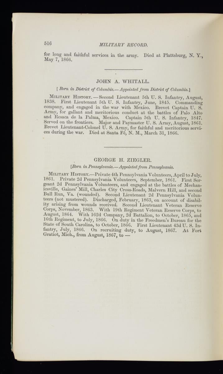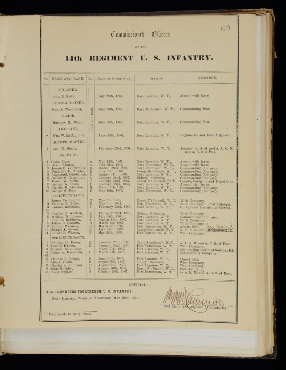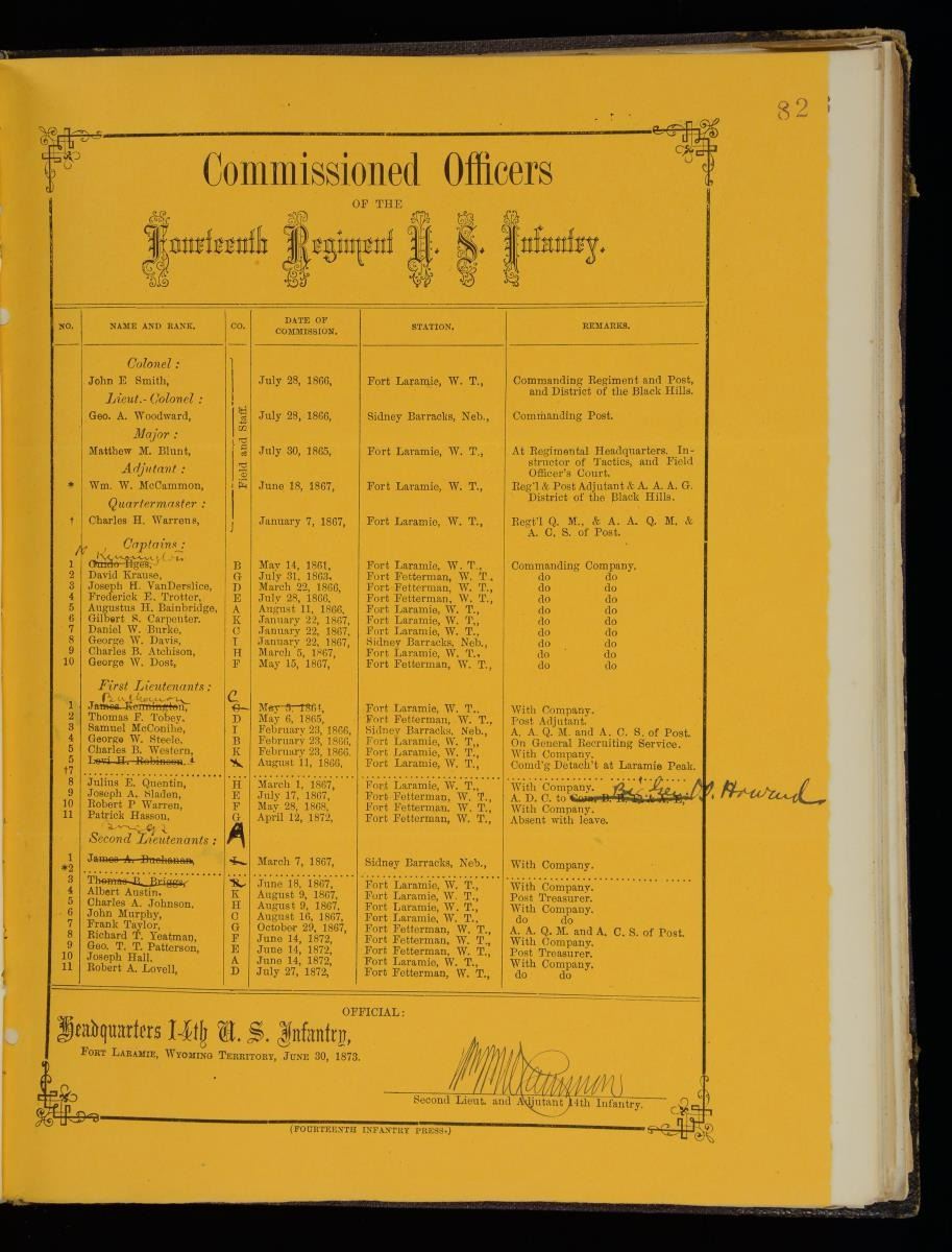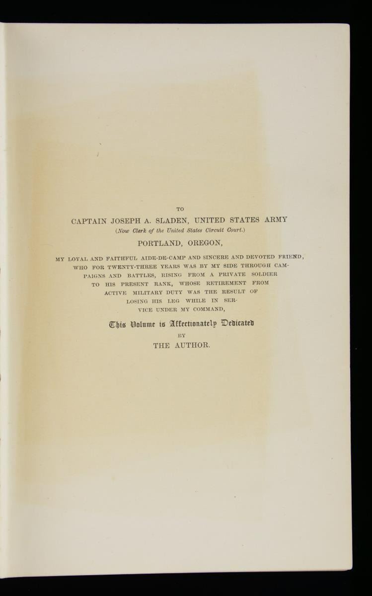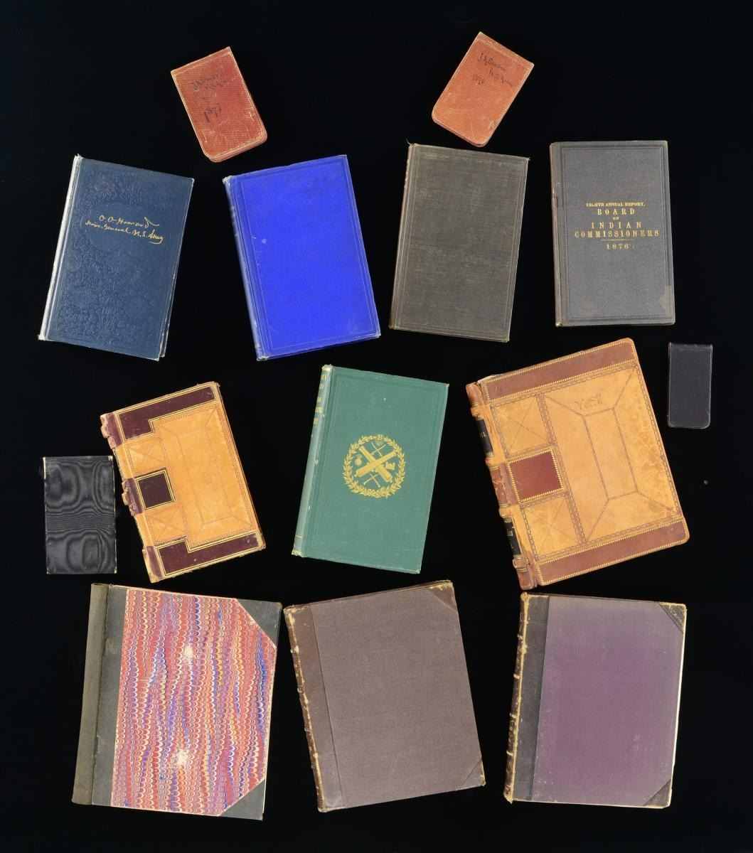 BOOKS, & MILITARY BOOKS. 1) three bound volumes containing over 250 signed General Orders concerning Sladen, the first is dated May 21, 1863 making him a corporal and a clerk; the last is dated December 5, 1894 putting him on the list of retired officers. in between there are numerous GOs from his numerous commands, all through the Atlanta campaign, with the 14th US Colored infantry, 17th Inf, 26th Inf. and 14th US Infantry including the GO for the hunt for and making peace with Cochise. Posts listed include Bureau of Refugees & Freedman, Washington and Nashville; Austin TX; Fort Laramie, Wyoming Ter; Montana Ter, Portland OR; Fort Walla Walla, Washington territory; Fort Colville, Washington Territory, Camp Douglas, Utah Ter.; Fort Vancouver, Washington territory; as aide de camp to general O Howard at West Point; Omaha NE, and more, his last assignment was Vancouver barracks, Washington territory. 2) Six diaries/journals 1877, 1878-1884, 1881, 1883-1885, 1892, and 1893. Sladen was a good writer and it is hard to put down when reading some day to day accounts. He writes for several days, long entries describing Yellowstone terrain & geysers from June 18-22, 1883, which intrigued him. 3) Two 33rd Massachusetts Regimental Histories, one by Andrew Boies & other by Adin Underwood, both published 1880, both inscribed by Sladen, one has a few annotations. 4) 1869 Military Record of Civilian Appointments, U.S. Army where he is listed along with his biography 5) 1907 text O.O Howard "My Life and Experiences Among Our Hostile Indians", the book is dedicated by Howard to Capt. Sladen and entire 2 chapters details their meeting with Cochise. 6) 1876 "Board of Indian Commissioners", 108pages, 1 foldout map. CONDITION: Good to very good overall. 02/17985-18/JS) $1,000-2,000.