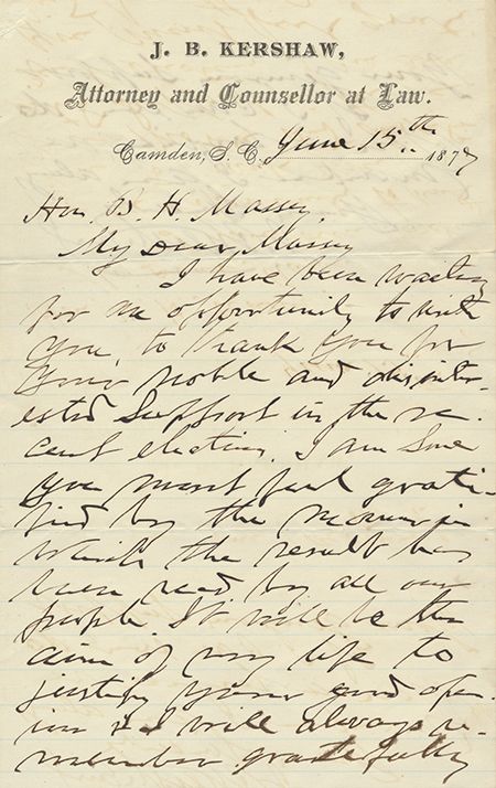 (1822 - 1894) Confederate major general who directed Morris Island in the bombing of Fort Sumter, commanded a brigade at Antietam, Chancellorsville, Fredericksburg and Gettysburg, captured at Sayler's Creek thus serving the entire war. Rare A.L.S. "J. B. Kershaw" on his law office letterhead, 2pp., 8vo., Camden, S.C., June 15, 1877, to Hon. B. H. Massey, in part: "...I have been waiting for the opportunity to write you to thank you for your noble and distinguished support in the recent elections...It will be the aim of my life to justify your good opinion & I will always remember gratefully your generous support...". Very good.
