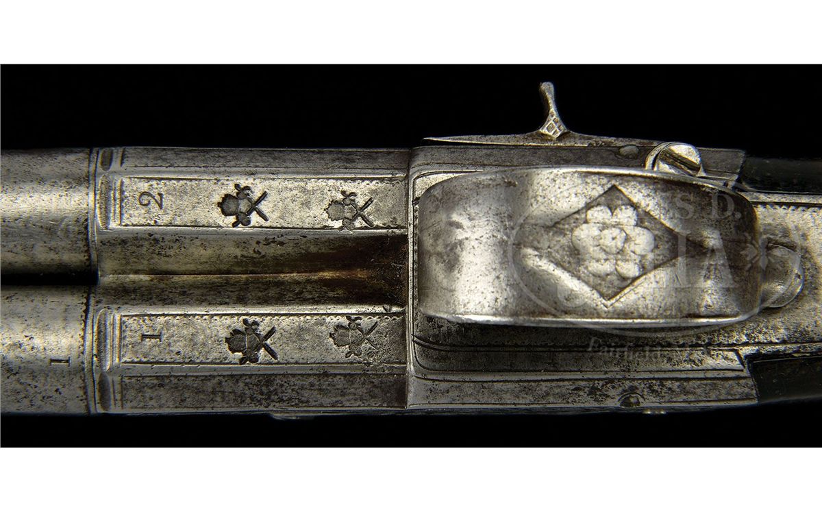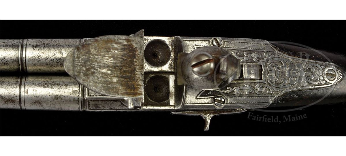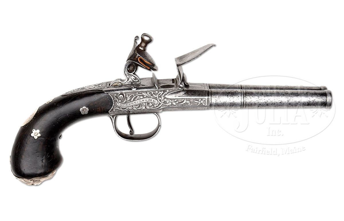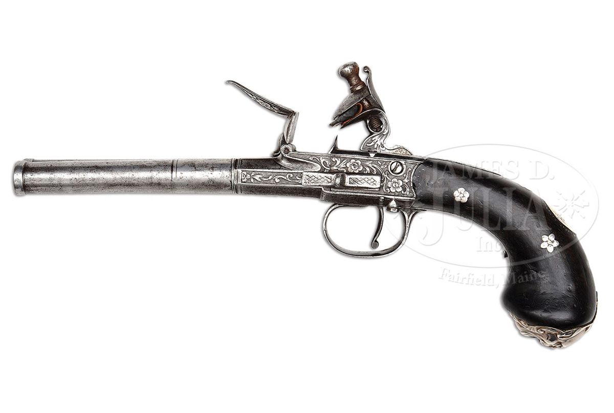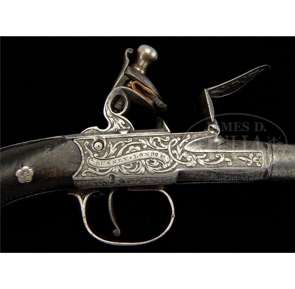 NSN. Cal. .430 Bore diameter. 4-1/8" Cannon bbls have star muzzles, one bbl is marked "1". Boxlock action with single cock and broad friction frizzen, can fire one barrel at a time, or both at once, by way of a sliding pan cover, which closes off pan of bbl number "2". Octagonal bbl bosses are stamped with Birmingham proofs and the numbers "1" and "2". Action, cock, and frizzen are engraved with deep chiseled, flowing, acanthus scroll with floral highlights, and have nicely stippled background. "BUNNEY - LONDON" (most likely Joseph Bunney, 1766 - 1780) is in scrolled riband on right side. European walnut knob grip stock is silver mounted, with grotesque mask at butt. Butt once had extensive silver wire inlay (now missing) with floral highlights (five flowers remain). Pistol measures 11-1/2" overall. CONDITION: Good. Steel parts are pewter patina over pinprick pitting. Silver is fine. 4-49670 MGM277