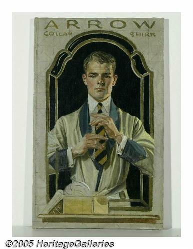 <B>JOSEPH CHRISTIAN LEYENDECKER (American 1874-1951)</B></I> <BR>Original Advertising Preliminary <Preliminary painting for an Arrow Collar ad. <BR>Oil on canvas <BR>20in. x 12in.RNot signed<BR><BR>J.C. Leyendecker's portrayals of handsome, stylishly dressed men remain world-famous symbols of fashionable American manhood. As author Michael Schau noted in his book, <I>J.C. Leyendecker</B></I>," The characters of F. Scott Fitzgerald's <I>The Great Gatsby</B></I> come to mind in many Leyendecker pictures of the twenties: well-to-do civilized people with self-confidence reinforced by breeding, education, position, and taste. They were sophisticated but not above gaiety." Leyendecker's Arrow Collar illustrations are celebrated as among the most stylish ever produced. Original art from the Arrow campaigns is rather scarce in the marketplace as the company has retained ownership of most of the paintings. Who was the Arrow Collar man? Charles Beach, Leyendecker's closest companion was a prime candidate. As cited in Michael Schau's monograph, actor Neil Hamilton, and a Leyendecker model himself, remarked, "I was making the rounds of the many film studios in Fort Lee, New Jersey, when a fellow actor pointed out Charles Beach to me on the lot and identified the dapper gentleman as the real Arrow Collar Man." As a preliminary, Leyendecker painted this detailed study over a lightly penciled grid, so that he could easily enlarge the image and correct any distortions. The work exhibits the bravura brushstrokes and reflected light and color that ensured J.C. Leyendecker a spot in the Society of Illustrators' Hall of Fame. The provenance of this piece makes for an interesting story. An art major at the College of New Rochelle had a once in a lifetime opportunity. She recalled, "I was painting in class and my art director, Mr. Ernest Thompson, arrived in a hurried manner. 'We have been given a great opportunity to purchase some art from a canvas yard sale of the recently deceased Joseph Leyendecker and you must beg, borrow, or steal any monies you can muster.' I proceeded to empty my bank account, just shy of a mere hundred or so dollars, and clambered into cars with a dozen other girls. There was a vast array of canvases flailing around that day and it did not occur to me until years later that I might have missed out on a small fortune. I have been the original owner since finding this piece tucked away in a pile of sketches among the feeding frenzy of dozens of fans only a short while after Leyendecker's demise in 1951. I was so happy that amid all the confusion I had found an actual original painting of the Arrow Man, which incidentally at the time, I youthfully thought was an antique. The God Lord has been good to me and to this day I have not regretted owning my little piece of illustrative history." <BR>