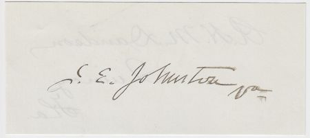 (1807 - 1891) Confederate major general who led armies at Bull Run and Seven Pines. Johnston is perhaps best remembered for his stubborn defense of Atlanta and his resistance to Sherman's March to the Sea. Bold signature "J. E. Johnston Va." on a small sheet. Very good to fine.