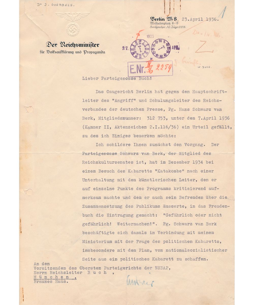(1897-1945) Nazi Minister of Propaganda with Hitler from the earliest days, a master of manipulation of the masses, who took his life and those of his family members in the last days of the war. Fine content T.L.S. 4 pp., 4to., Berlin, Apr. 23, 1936 to Walter Buch, chief of the Supreme NSDAP Court, intervening in the court case against his friend Hans Schwarz van Berk, editor-in-chief of the Nazi paper "Der Angriff". After a visit in December 1934 to the political Berlin cabaret "Die Katacombe", Hans Schwarz van Berk wrote into the guestbook: "Dangerous or not dangerous! Carry on!", which caused him to be accused of damaging behavior against the Party by former colleague Hans-Joachim Rechenberg, partly due to personal differences. Goebbels explains the circumstances of the case: "…van Berk was working in connection with my department regarding the creation of a National Socialist political cabaret...The cabaret was closed in May 1935 on my orders…in part due to the questionable demographic of the audience". Prior to the closing Goebbels had planted secret police in the audience to report back to him. He adds: "…after the closure, van Berk wrote an article defending the actions of the government....Rechenberg, who knew about the entry in the guestbook, did not use this information until November 1935 when, in absence of van Berk, while intoxicated, he insulted him and called him a scoundrel...I should point out...Rechenberg had professional differences with van Berk… and was behind several personal attacks…which ended in dismissal of Rechenberg from the Eher Publishing Company...I believe it is very harsh, condemning an editor for defending the actions of the state...I ask to take into account that Schwarz van Berk is of invaluable service to the state and the movement through his countless publications as a respected national-socialist journalist. Please take my opinion into account when deciding on a final judgment...Heil Hitler! Your Dr. Goebbels". Four tears in upper left hand corner professionally repaired with tape. Paperclip marks top right, files holes and folds, else fine.