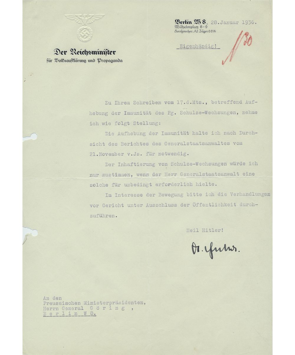 (1897-1945) Nazi Minister of Propaganda with Hitler from the earliest days, a master of manipulation of the masses who took his life and those of his family members in the last days of the war. Fine association and content T.L.S. "Dr. Goebbels", self-typed (and so stated) on his Reichsminister of Propaganda letterhead, 1p. 4to., Berlin, Jan. 28, 1936 to HERMANN GORING. In part: "...Regarding your letter...the repeal of the immunity of Party Member [Walter] Schulze-Wechsungen, here is my position...after the review of the report from the Attorney General...I believe that the repeal of immunity is necessary...internment only if the Attorney General believes it is absolutely necessary. I request that in the interest of the Movement that the negotiations take place with the public excluded...". File holes at left, else fine. WALTER SCHULZE-WECHSUNGEN (1902-1944) was the top propagandist in Goebbel's ministry. In 1933 he was elected to the Prussian Parliament, and later received a seat in the Reichstag. Charges of corruption led to his arrest, internment at Orianenburg, and eventual death at that place.
