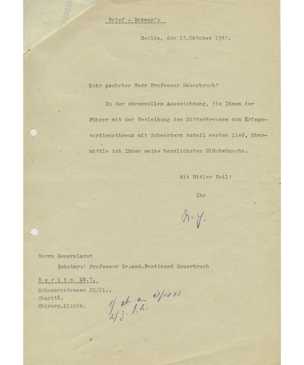 (1897-1945) Nazi Minister of Propaganda with Hitler from the earliest days, a master of manipulation of the masses who took his life and those of his family members in the last days of the war. Draft T.L.S. "Dr. G" in indelible pencil. , 1p. 4to., Berlin, Oct. 13, 1943 to Prof. Ferdinand Sauerbruch sending his congratulations upon the latter having been awarded the Knights Cross of the War Merit Cross with Swords. Also included is a typed response from Sauerbruch to Goebbels, 1p. 4to., Nov. 8, 1943 acknowledging Goebbels' letter. FERDINAND SAUERBRUCH (1875 - 1951) was a German surgeon and a fervent nationalist who wanted to undo the "humiliation of Versailles". Surgeon General to the army, he was charged by allies with having contributed to the Nazi dictatorship, but not convicted for lack of evidence.