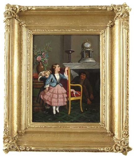 JOSEPH GYSELINCKX (Belgian, 1845-) HIDE AND SEEK. Oil on wood panel scene shows two young girls and a boy playing hide and seek in an interior house setting. A vase of roses sits atop table next to armchair with doll. A boy huddles under mantle having mantle clock and compote. Green checkered flooring below. Signed lower right “J. Gyselinckx”. Housed in a regilt antique gesso decorated frame. SIZE: 11” x 8-1/2”. CONDITION: Very good. 9-26797