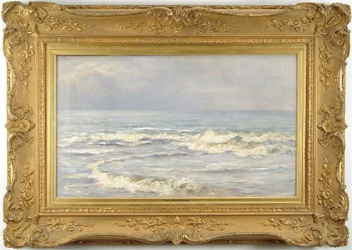 JOSEPH HENDERSON (Scottish, 1832-1908) WAVES ON THE BEACH. Large oil on canvas scene shows small waves rolling onto flattened water. Predominant colors of blues and white. Housed in a magnificent gesso decorated wide frame with gilt liner. Liner has artist’s name. Also “R. S. W.”. SIZE: 18” x 30”. CONDITION: Very good. 9-26439